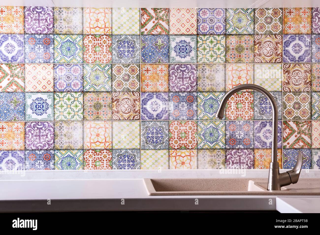 Self-adhesive tile is still more affordable than ceramic or tile. Some options can be applied to reduce unnecessary money for installing kitchen backsplash. First, choose a small number of self-adhesive tile. Install the tile for sink and stove subsections of the kitchen only. This saves a lot of money already. Mosaic tile kitchen sinks in white and blue colors Mosaic tile designs are created with small flat pieces glued over a supportive mesh backing that eventually create a seamless tiled surface. Simple tiling technique is great for creating unique shower designs, wall decoration, floor, countertops and bathroom sinks. Choose tile